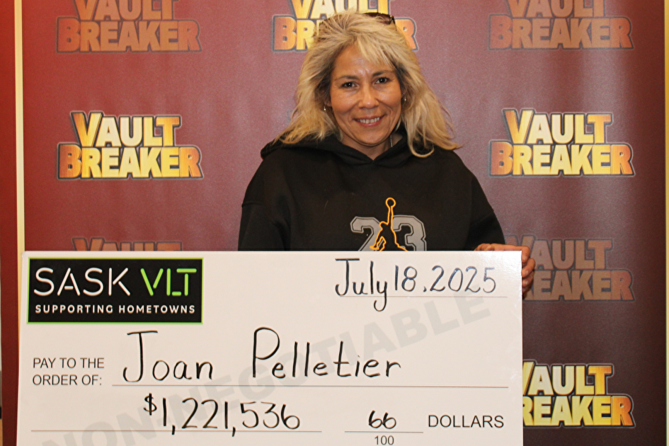 Shell Lake, SK – Western Canada Lottery Corporation (WCLC) is pleased to announce a Vault Breaker jackpot prize awarded by the Saskatchewan VLT program. Joan Pelletier of Mont Nebo was awarded $1,221,536.66 after winning the grand jackpot on Vault Breaker at the Shell Lake Hotel in Shell Lake on July 18.