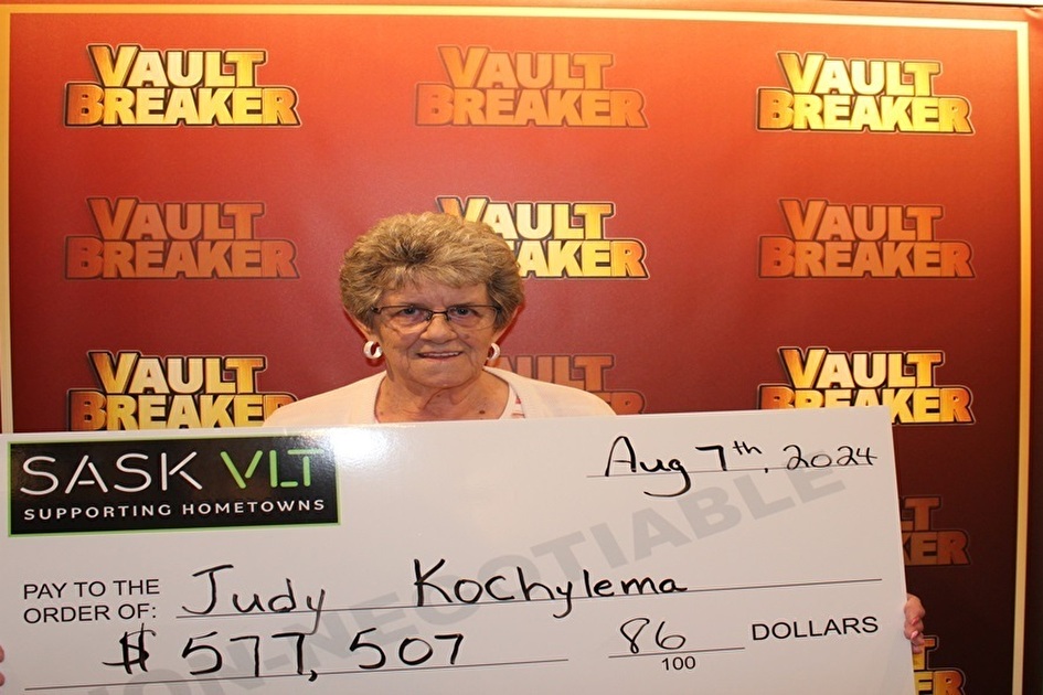 Regina, SK – Western Canada Lottery Corporation (WCLC) is pleased to announce a Vault Breaker jackpot prize awarded by the Saskatchewan VLT program. Judy Kochylema of Regina was awarded $577,507.86 after winning the grand jackpot on Vault Breaker at Westside Pizza in Regina on August 7.